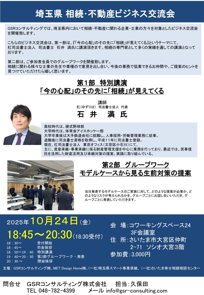 この度、さいたま幸せ相続相談センターでは、4社共催にて、相続・不動産に関わるビジネスを埼玉県内で行っている企業・士業の皆さまを対象としたビジネス交流会を開催いたします。