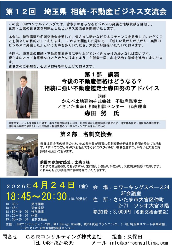 この度、さいたま幸せ相続相談センターでは、埼玉県内で相続・不動産に関連する事業を展開されている企業様や士業の皆さまを対象に、5社共催によるビジネス交流会を開催することとなりました。